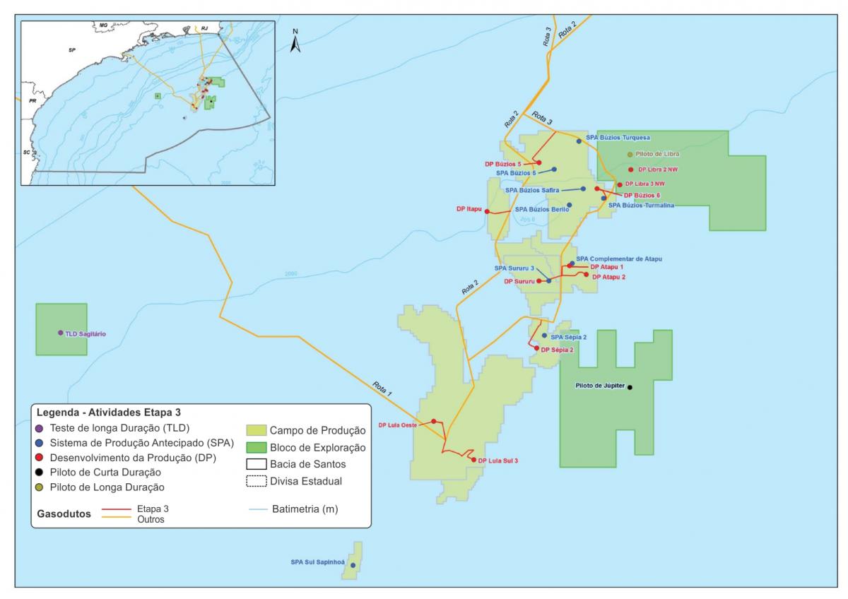 Com o objetivo de aumentar a produção de petróleo e gás natural no país, a Petrobras vem trabalhando no terceiro projeto de licenciamento ambiental, coordenado pelo Ibama, de um conjunto de empreendimentos. Conhecido como Etapa 3,o projeto consiste na instalação e operação de um conjunto de plataformas e gasodutos no pré‐sal da Bacia de Santos.