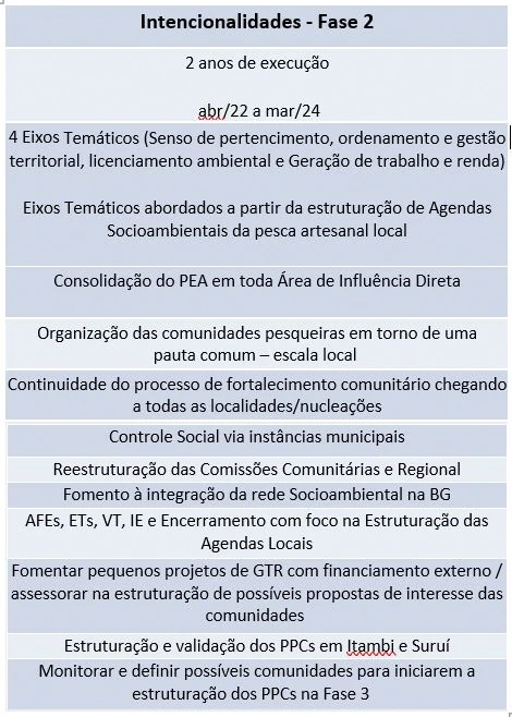 O Projeto de Educação Ambiental da Baía de Guanabara adentra a Fase 2 (abril/22 a mar/24) promovendo por meio de processo educativo, o fortalecimento da organização social, política e econômica das comunidades que exercem a pesca artesanal na Baía de Guanabara, a fim de intervirem de forma qualificada na gestão socioambiental do seu território. Mantém-se a Linha de Ação A (Organização comunitária para a participação na gestão ambiental, no âmbito do licenciamento ambiental), prevista na Nota Técnica CGPEG/DILIC/IBAMA nº 01/2010, como orientadora das atividades do projeto.