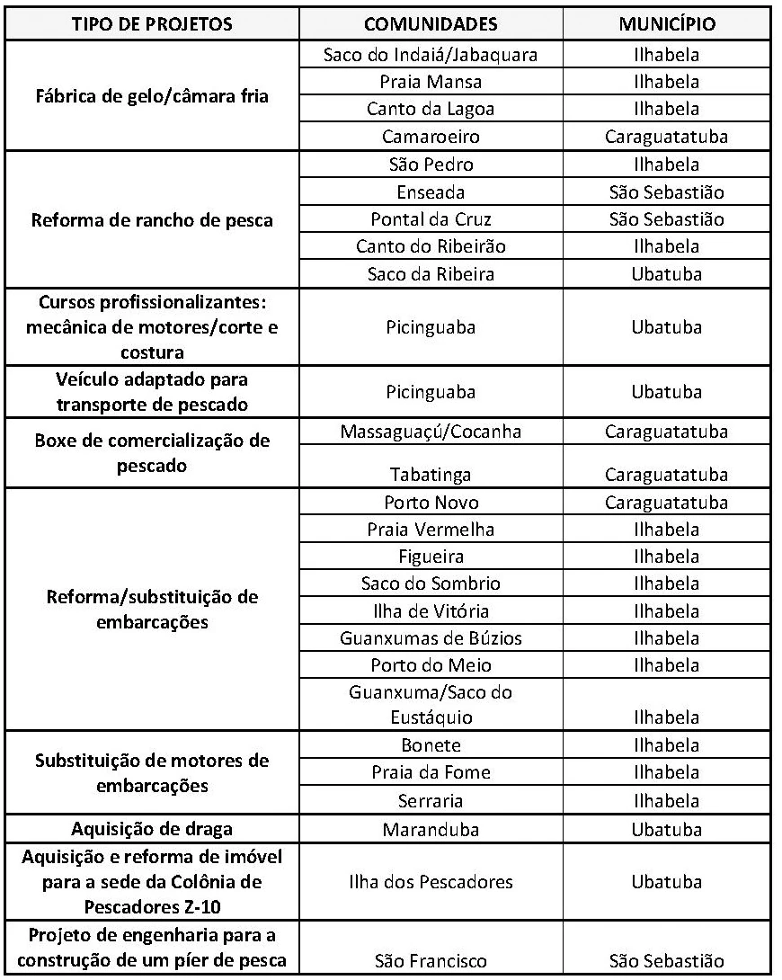 - Projetos de recuperação da frota pesqueira artesanal: execução de ações para proporcionat melhorias nas embarcações contempladas pelo programa, como reforma ou substituição de embarcações, reforma ou substituição de motores e adequação dos materiais de salvatagem, de acordo com os padrões exigidos pela Capitania dos Portos de São Sebastião. Adicionalmente foram realizados a regularização documental e cursos de primeiros socorros, combate a incêndio e mecânica básica de motores de embarcações.