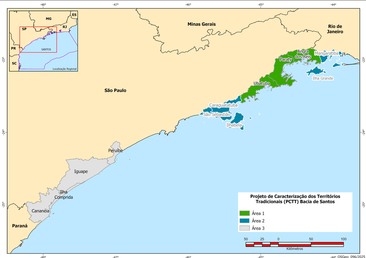 A execução do projeto avança conforme áreas numeradas, agrupadas por municípios próximos que, dessa forma, guardam similaridades quanto à geografia e territórios tradicionalmente ocupados por comunidades. A Área 1 contemplou Paraty, Ubatuba e a parte continental de Angra dos Reis, levantando informações de aproximadamente 100 comunidades. Desde o ano de 2024 a Área 2, que abrange os municípios de São Sebastião, Caraguatatuba, Ilhabela, Mangaratiba e Ilha Grande em Angra dos Reis, passou a ser objeto da caracterização, com atividades previstas até o ano de 2029. A Área 3, que considera os municípios de Ilha Comprida, Iguape, Cananéia e Peruíbe, encontra-se em fase de mobilização das comunidades e lideranças para construção de um termo de referência que especifique seu processo de caracterização.