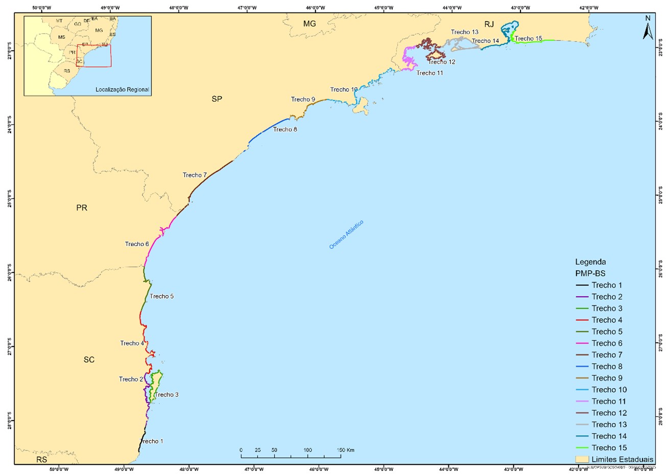 A Fase 1 do PMP-BS, realizada em Santa Catarina (desde Laguna), Paraná e São Paulo (até Ubatuba), foi coordenada pela Univali e iniciada em agosto de 2015. A Fase 2 do PMP-BS, realizada no Rio de Janeiro (de Paraty até Saquarema) foi executada pelo CTA – Serviços em Meio Ambiente e iniciada em setembro de 2016. Em 2019, as Fases 1 e 2 foram consolidadas no Projeto Executivo Integrado (Revisão 0), tendo sido substituído pela Revisão 1, em 2023.