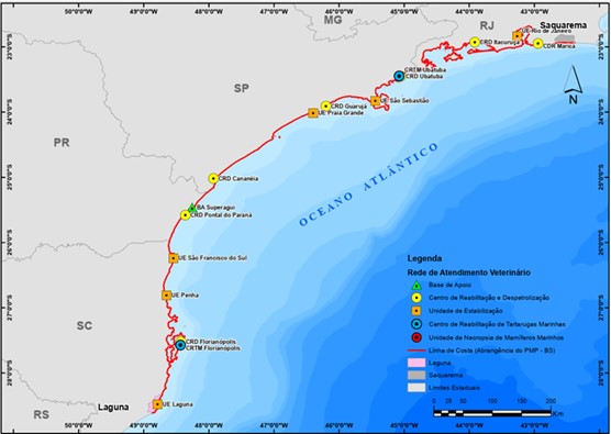 A Rede de Atendimento Veterinário é composta por sete Centros de Reabilitação e Despetrolização de Animais Marinhos (CRD) localizados nos municípios de Maricá (RJ), Mangaratiba (RJ), Ubatuba (SP), Guarujá (SP), Cananéia (SP), Pontal do Paraná (PR) e Florianópolis (SC); seis Unidades de Estabilização de Animais Marinhos (UE), localizados no Rio de Janeiro (RJ), São Sebastião (SP), Praia Grande (SP), São Francisco do Sul (SC), Penha (SC) e Laguna (SC), base de apoio no Parque Nacional de Superagui (PR), Centros de Reabilitação de Tartarugas Marinhas em Ubatuba (SP) e Florianópolis (SC) e uma Unidade de Necropsia de Mamíferos Marinhos, localizada no Rio de Janeiro (RJ). A localização dessas instalações consta na figura a seguir.